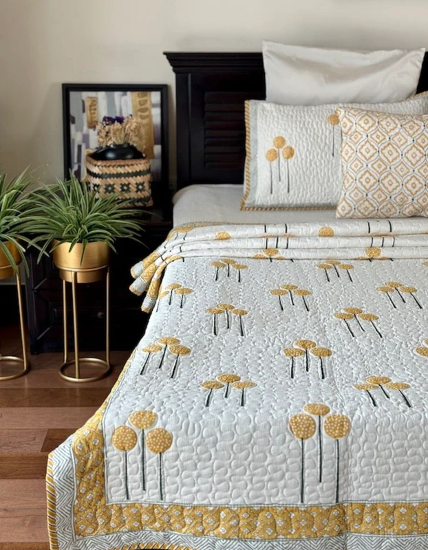 Blossom Handblocked Printed Quilted Bedcover With 2 Quilted Pillow Covers