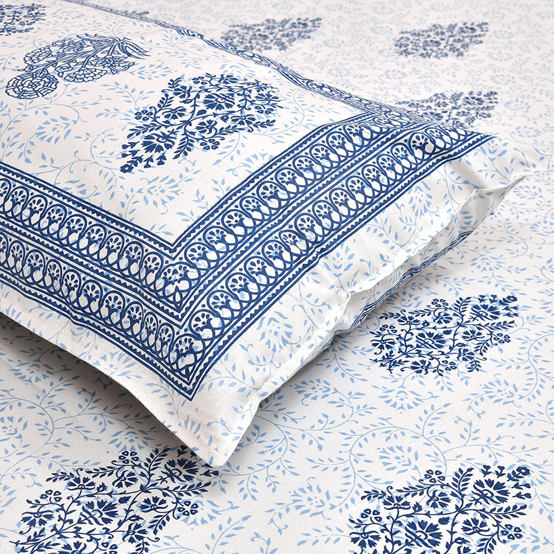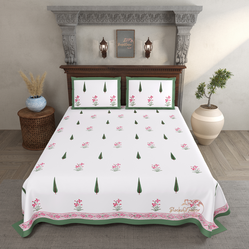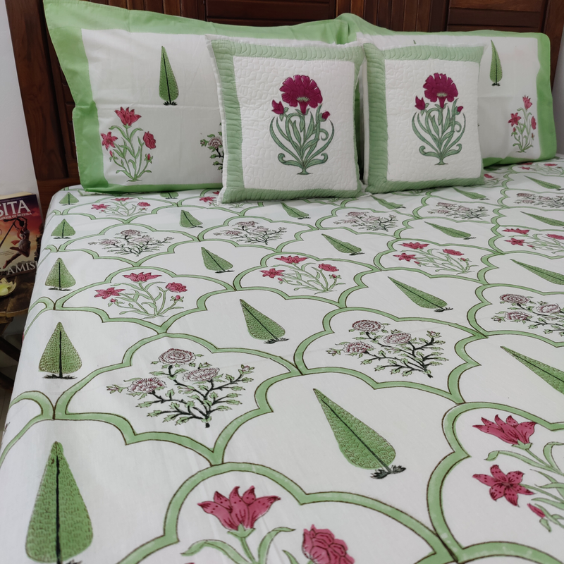 SPRING GREEN – Hand Block Printed Bedsheet with 2 Reversible Pillow Covers